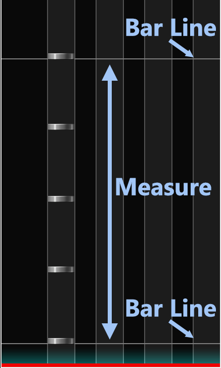IIDX has the same concepts, though rotated. Horizontal lines are bar lines, and the section between bar lines is a measure. Let’s take the beginning of Quasar SPH as an example.